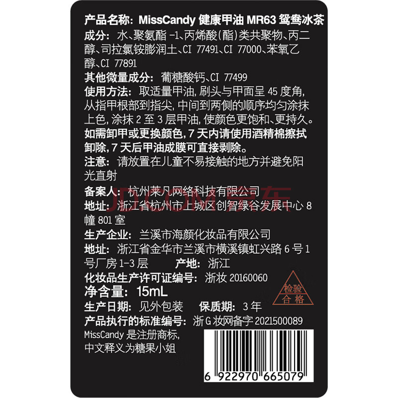 商品相册:Miss Candy显白健康15ml指甲油免烤快干持久可撕拉裸色亮片美甲 闪透裸 MR63第