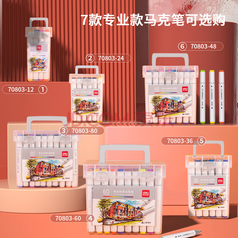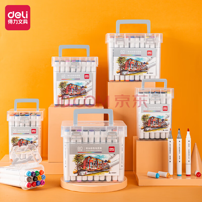 商品相册:得力(deli)70803-60色酒精性三角杆马克笔(混)(60色/桶)1桶水性马克笔儿童可水洗小学生用套装彩色双头水彩笔第