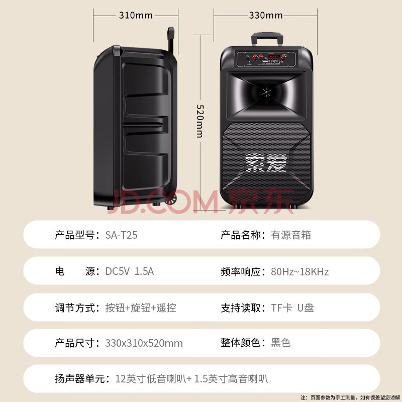 商品相册:索爱(soaiy)12吋广场舞音响大功率便携式户外重低音蓝牙k歌专用大音量移动拉杆音箱室外演出设备双话筒SA-T25第