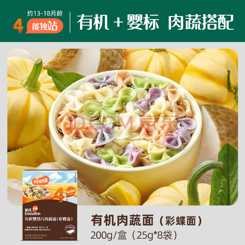 商品相册:英氏有机婴幼儿彩蝶面200g 婴儿面条蝴蝶面儿童早餐辅食面条 采销验厂第