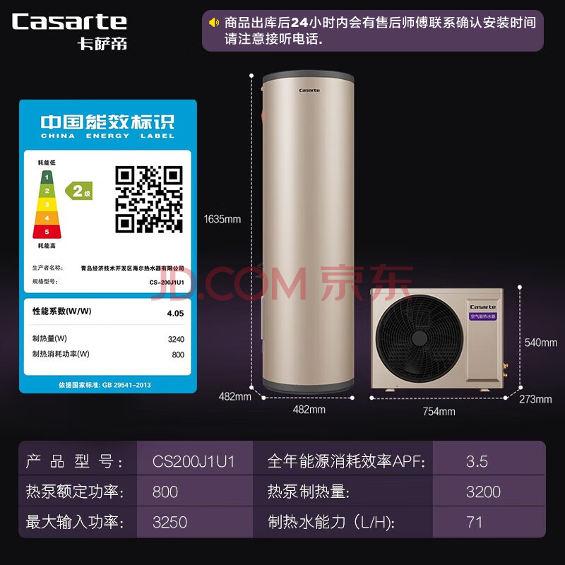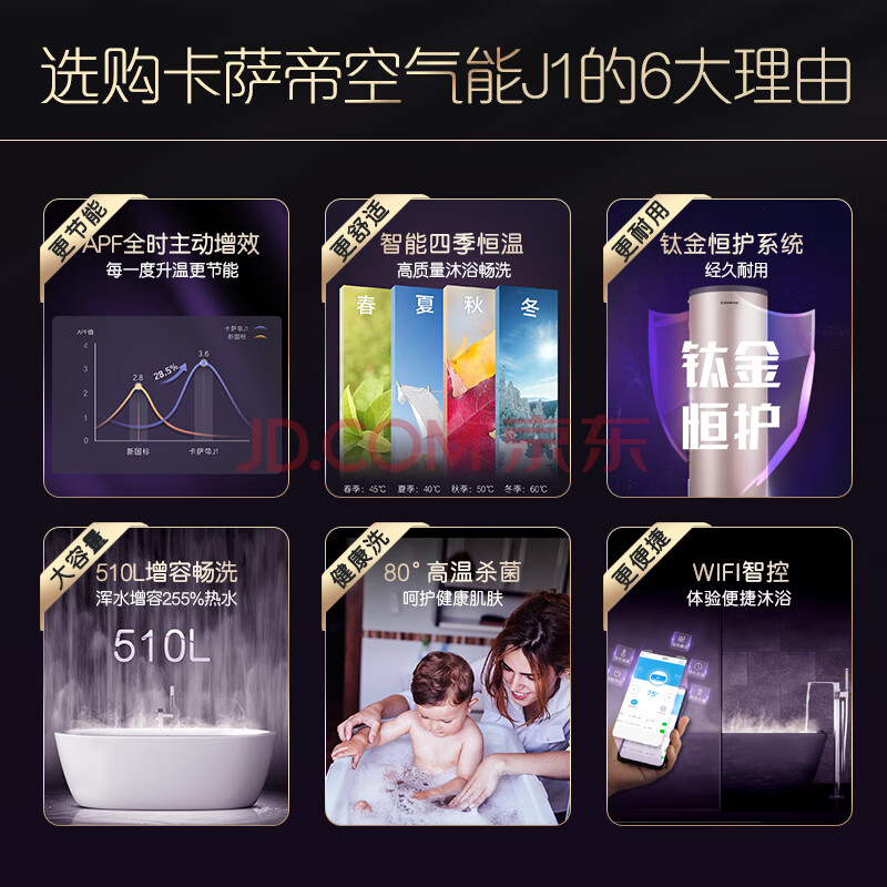 商品相册:卡萨帝(Casarte)空气能热水器家用200升APF全时增效钛金恒护双源速热WIFI80°C杀菌净洗CS-200J1U1一价全包第1张/共6