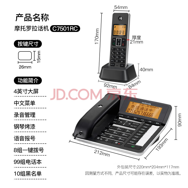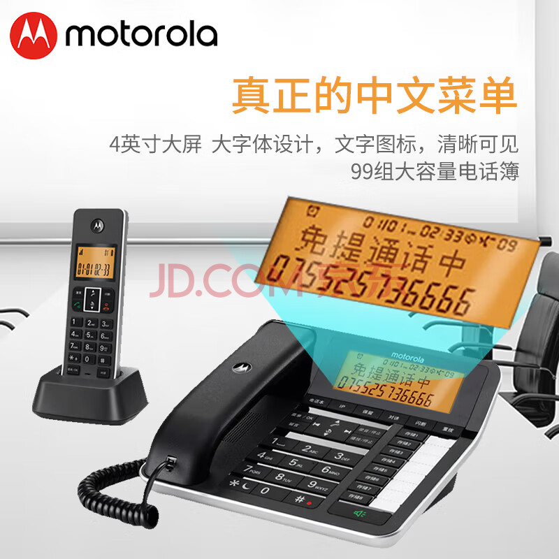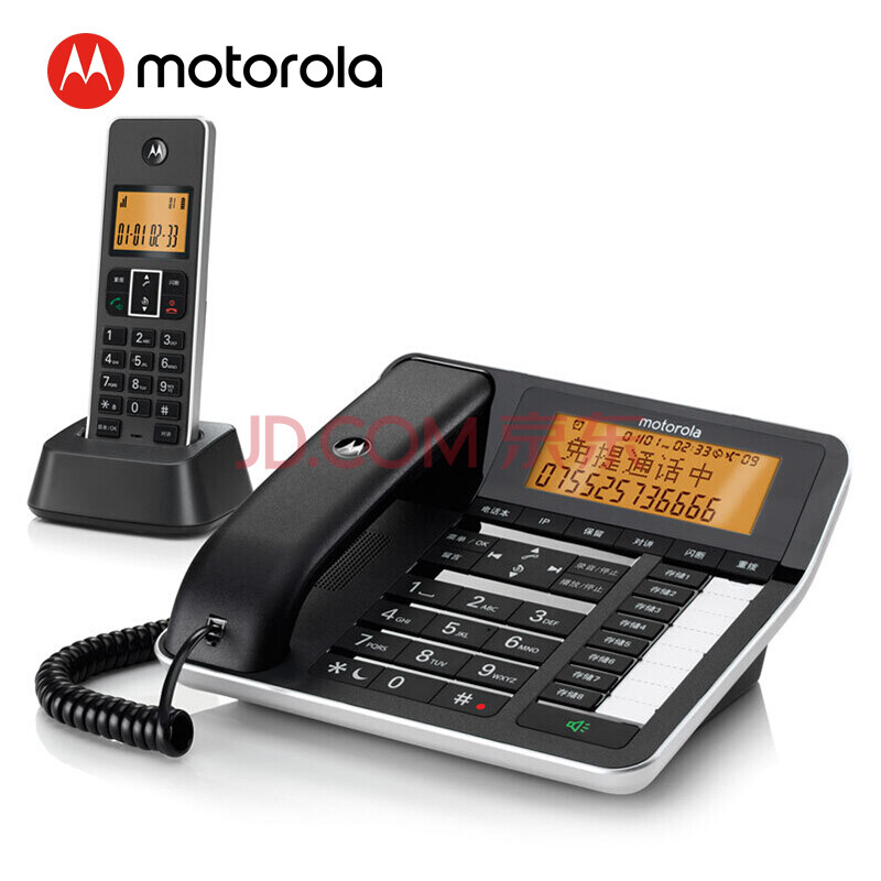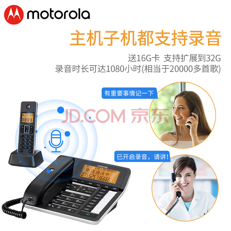 商品相册:摩托罗拉(Motorola)录音电话机子母机 远距离无绳无线座机 电销固定电话16G 钢琴烤漆 办公家用领导经理电话 C7501RC第1张/共8
