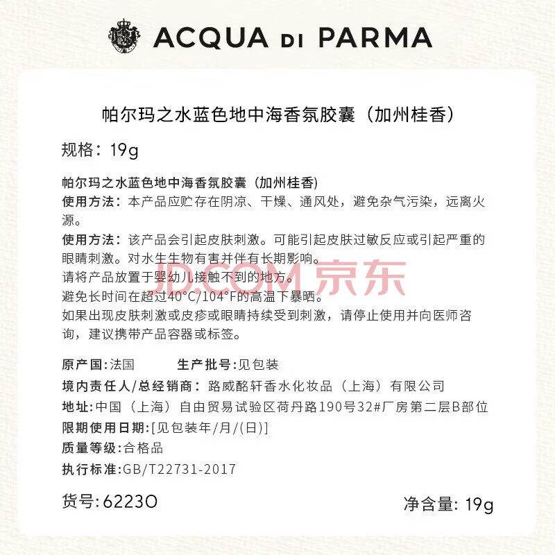 商品相册:帕尔玛之水【王安宇同款】蓝色地中海车载香氛胶囊(加州桂香)19g 生日礼物第1张/共3