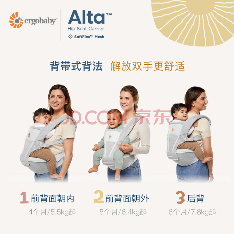商品相册:ERGObaby美国二狗婴儿背带腰凳Alta全阶段省力透气6种背法可拆卸自然米色第