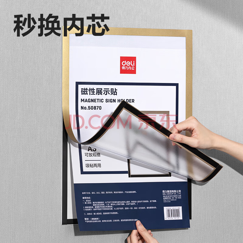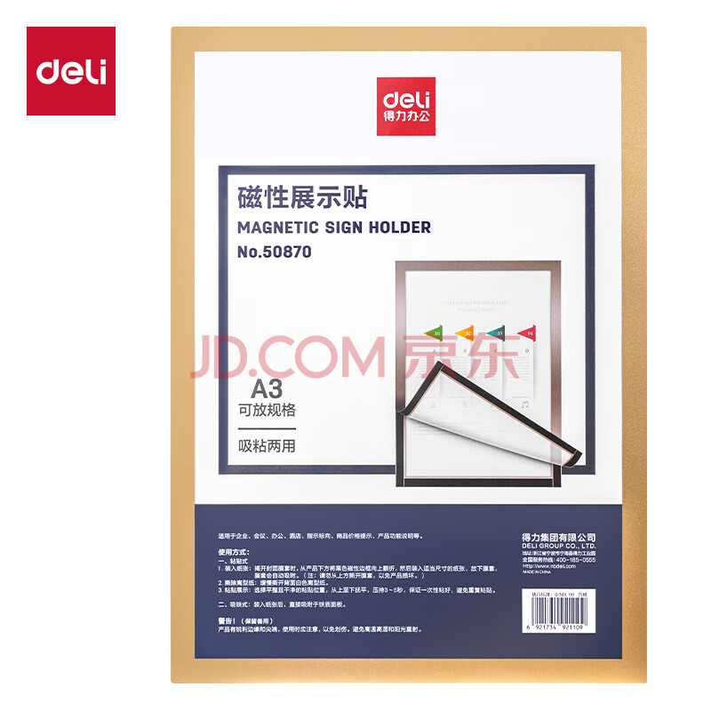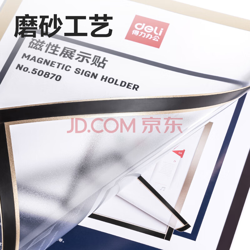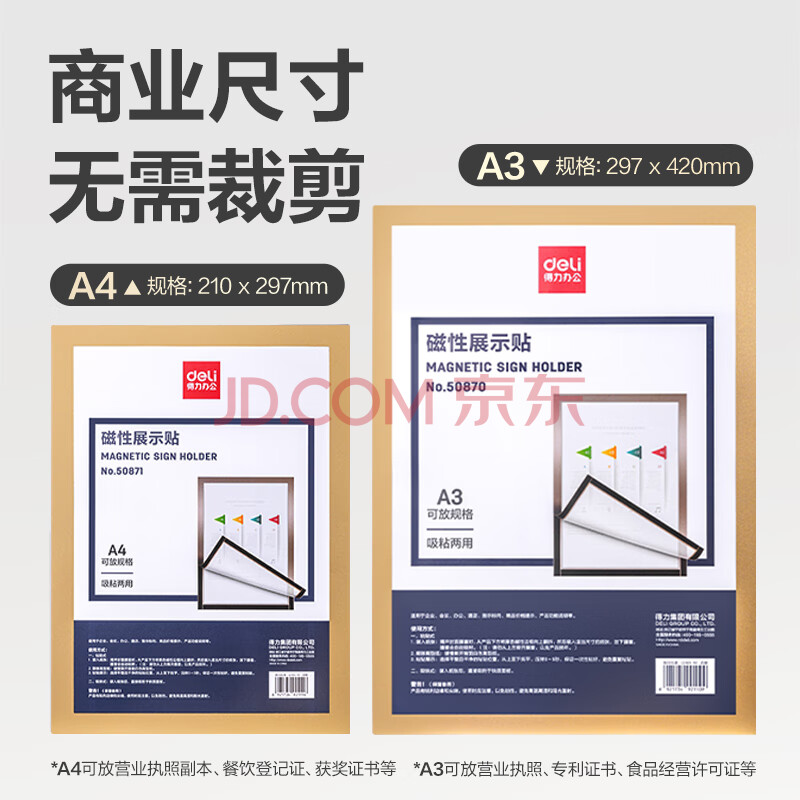 商品相册:得力(deli)A3磁性展示贴 营业执照正本保护套文件框 公告栏通知贴纸 金色TF110(原老款50870)第