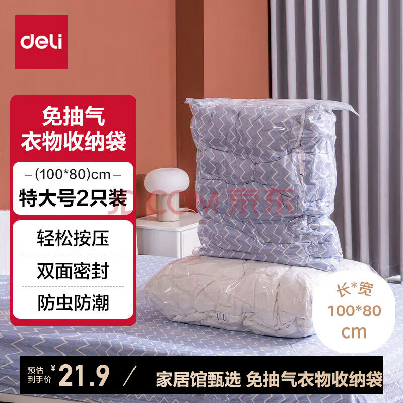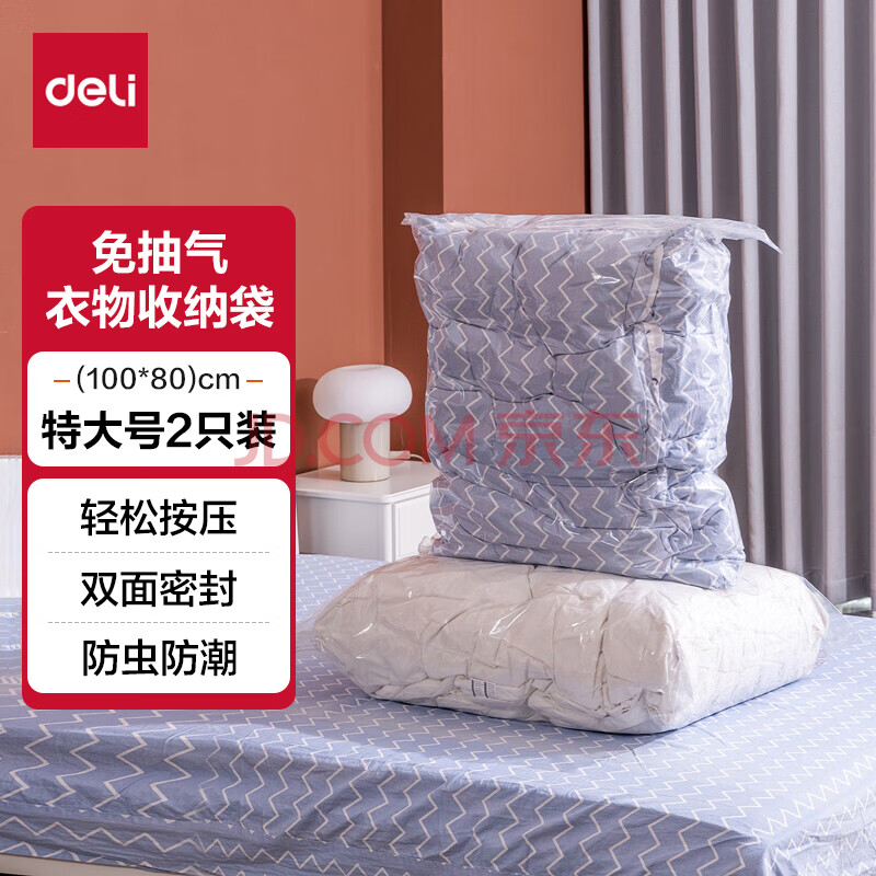 商品相册:得力(deli)免抽气真空压缩袋 棉被衣服旅行用品收纳袋 100*80cm 2只装 14919第
