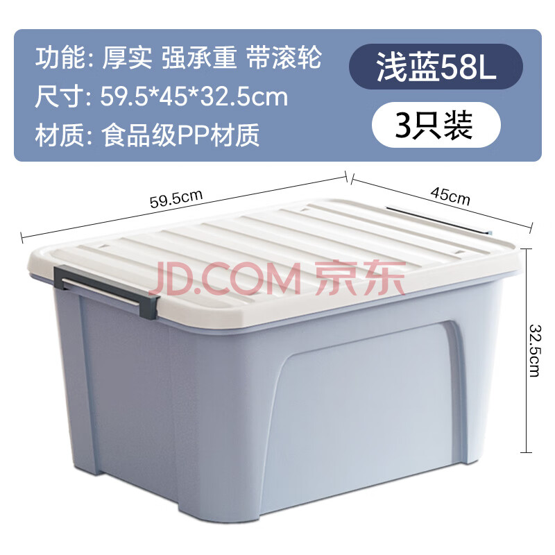 商品相册:茶花塑料衣物收纳箱棉被整理箱58L 蓝色 3个装 带轮第