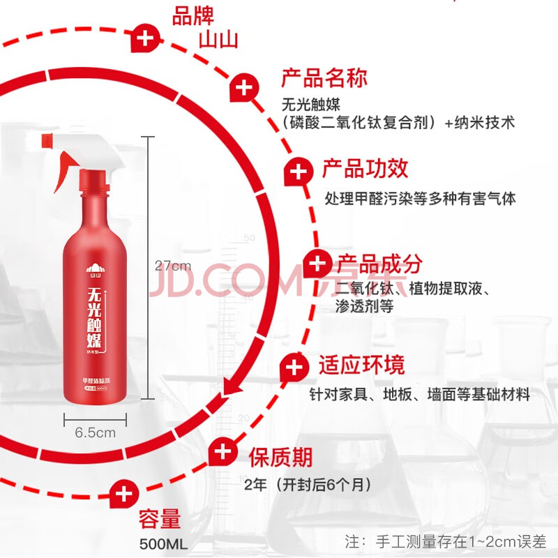 商品相册:山山强力除甲醛清除剂去甲醛无光触媒喷剂室内高效除异味活性炭500ml第