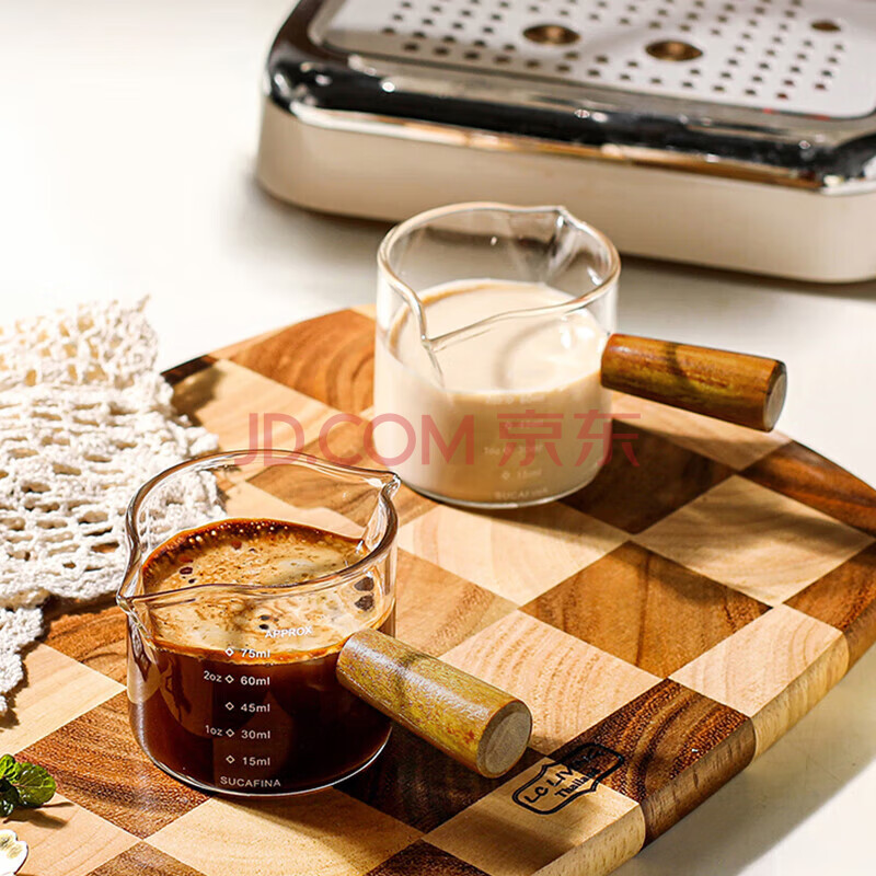 商品相册:品喻(PINYU)咖啡量杯玻璃带双刻度意式浓缩咖啡萃取杯双导流口木柄小奶盅奶杯第