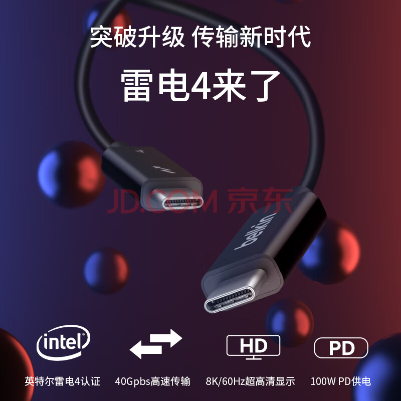 商品相册:贝尔金(BELKIN)雷电4数据线 英特尔认证 PD快充100W Type-C公对公视频传输 充电线 2米主动式 INZ002第