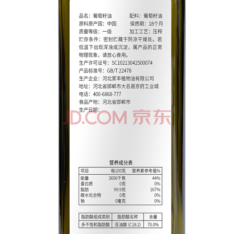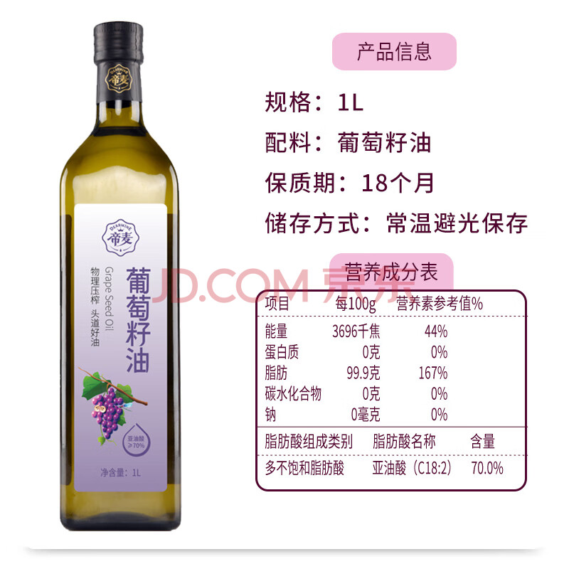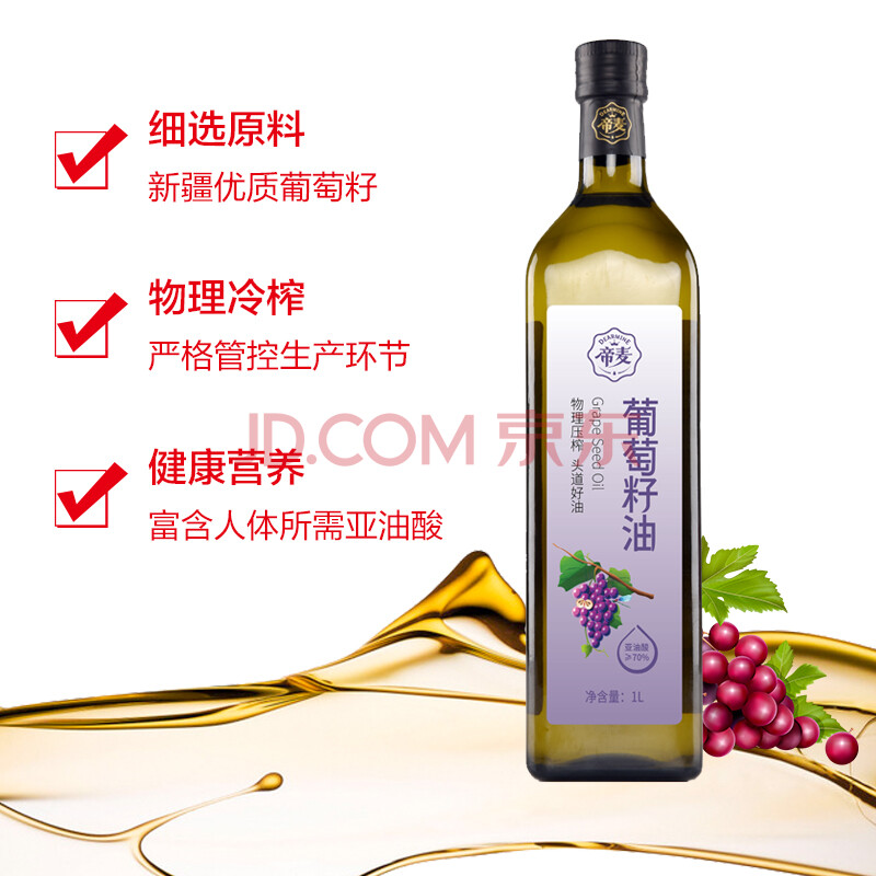 商品相册:帝麦 食用油 物理压榨葡萄籽油1L 热门商品第1张/共8