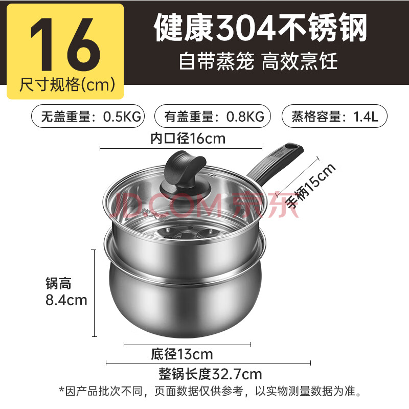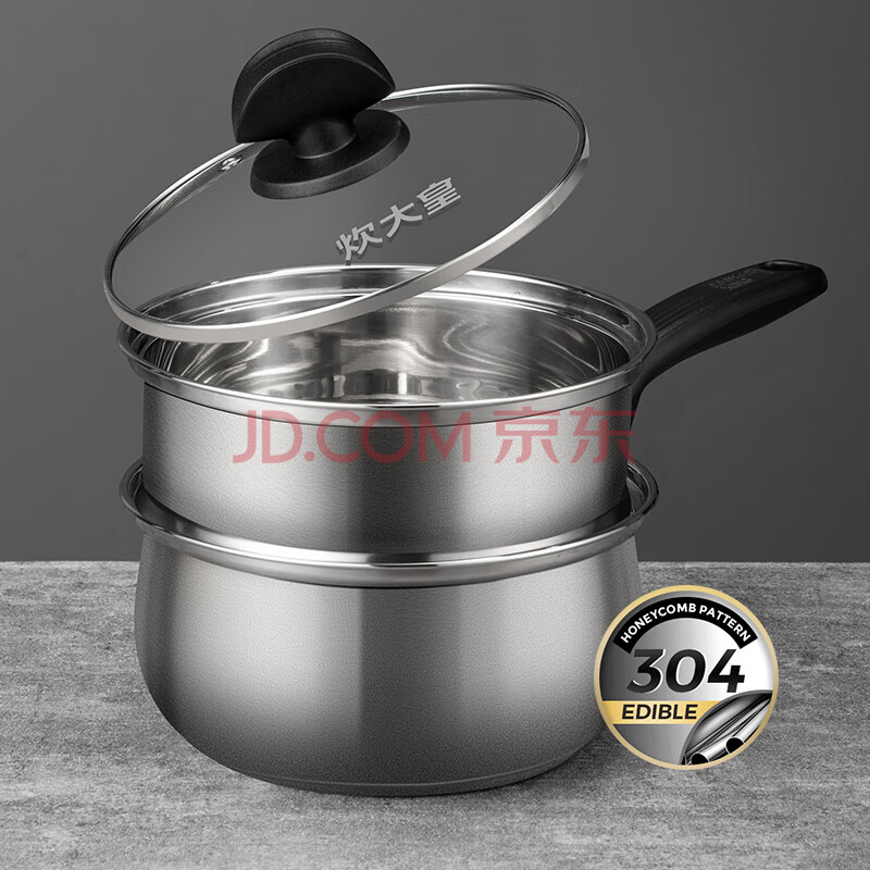 商品相册:炊大皇304不锈钢奶锅16cm带蒸屉 辅食锅汤锅婴儿宝宝煮牛奶热奶锅第