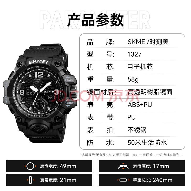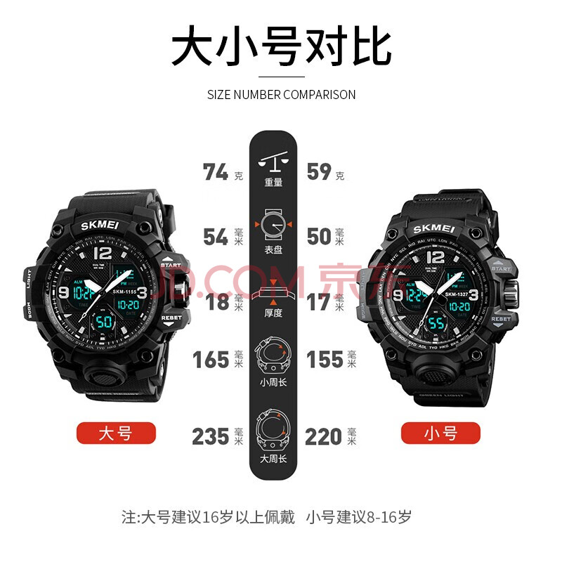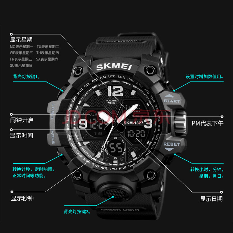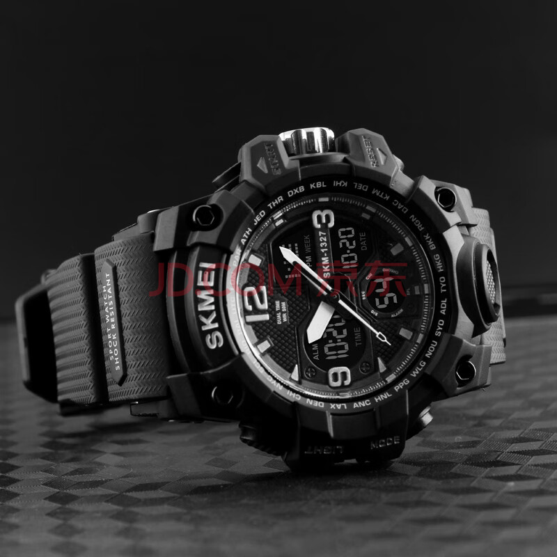 商品相册:时刻美(skmei)学生手表运动青少年初高中生儿童多功能夜光闹钟防水电子表1327黑第