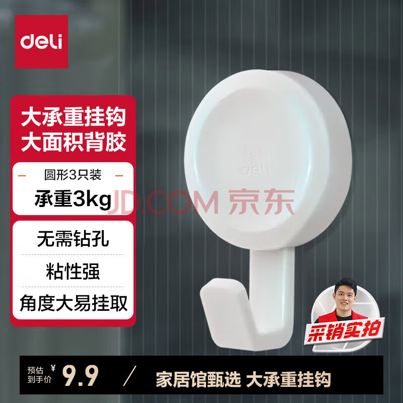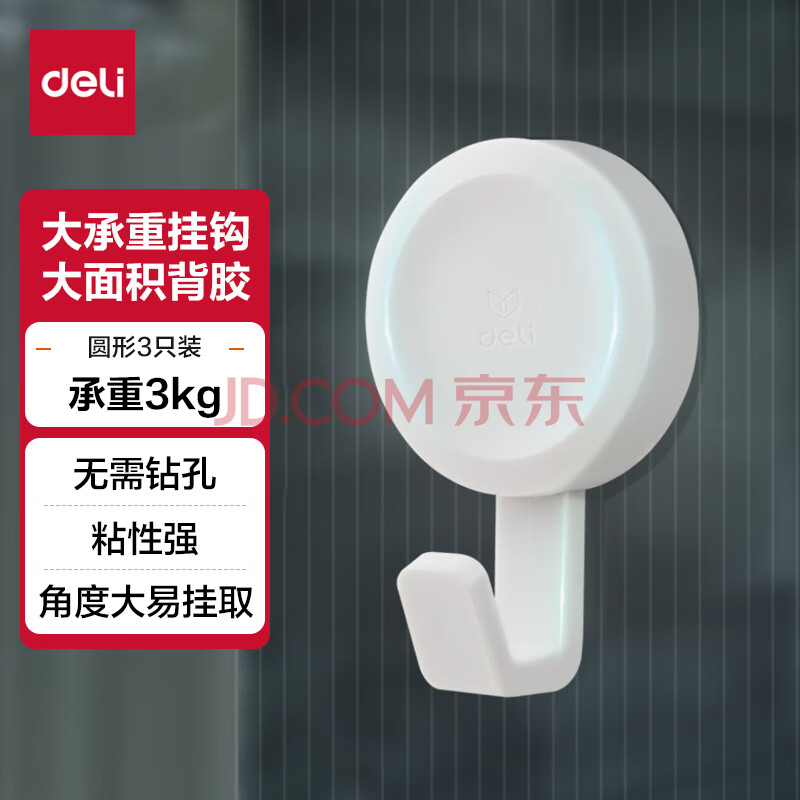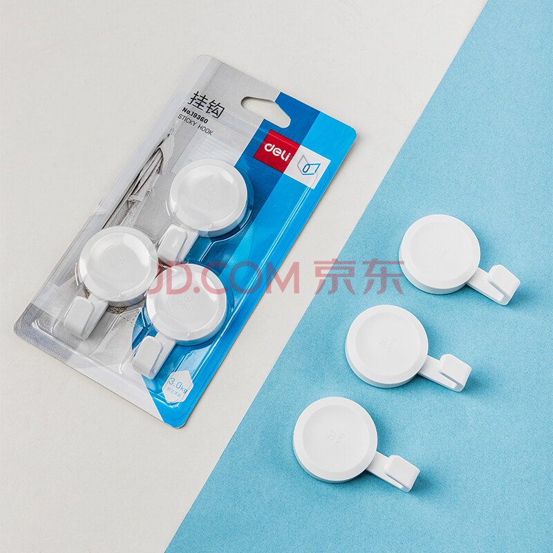 商品相册:得力(deli)居家生活挂钩 3kg大承重免打孔 浴室挂钩3只/卡 简约风 白色19360第