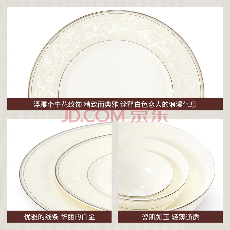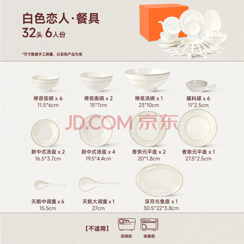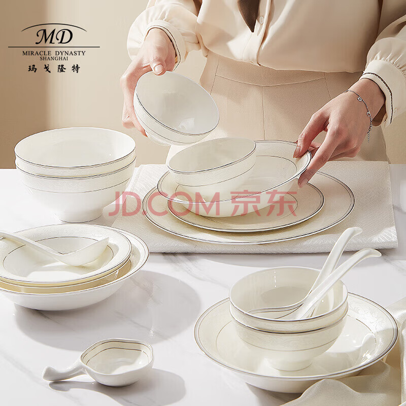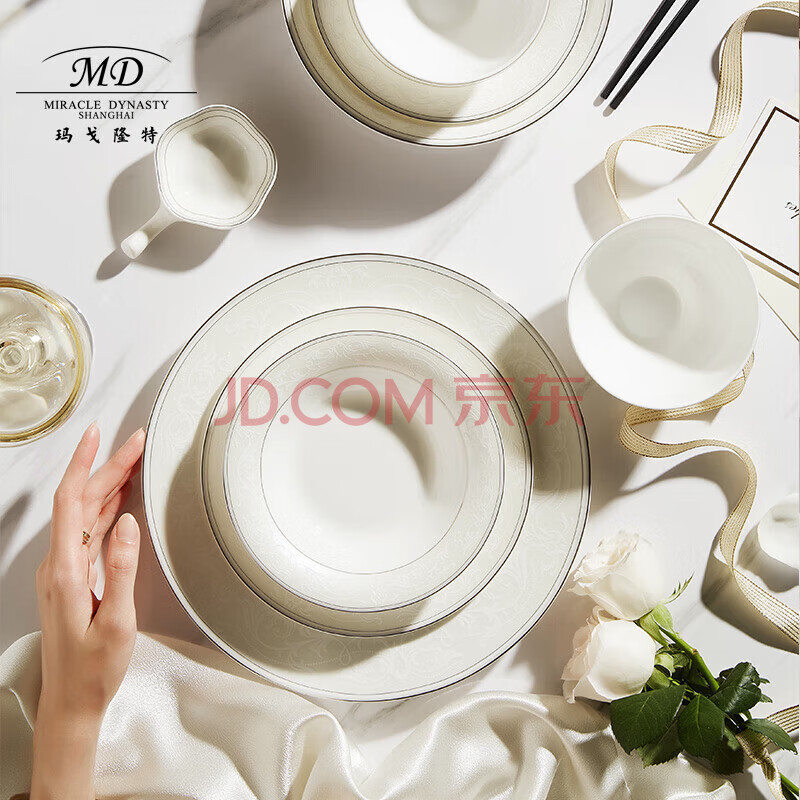商品相册:玛戈隆特骨瓷餐具整套纯白轻奢碗碟盘餐具套装6人份32头白色恋人第