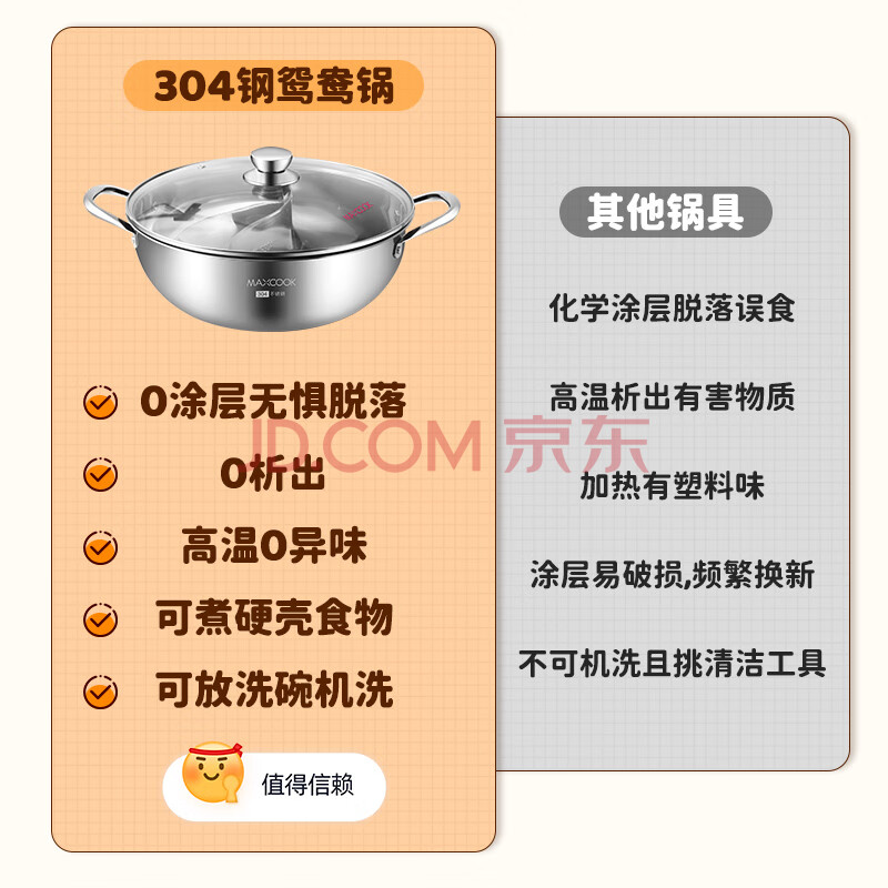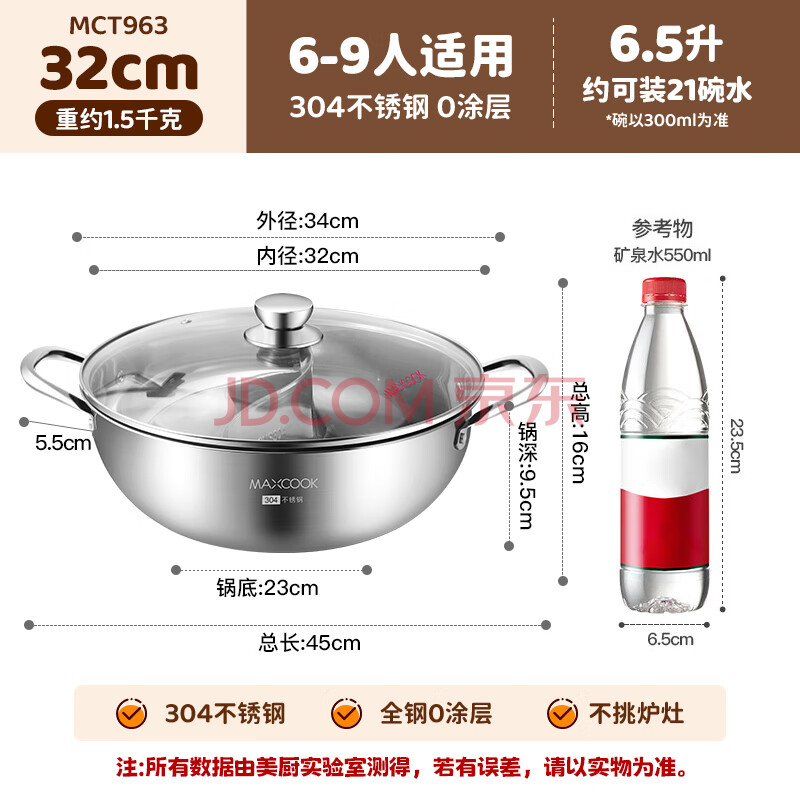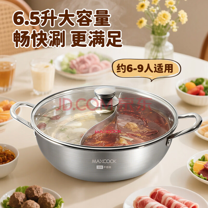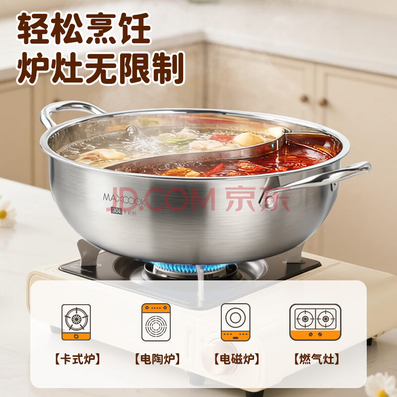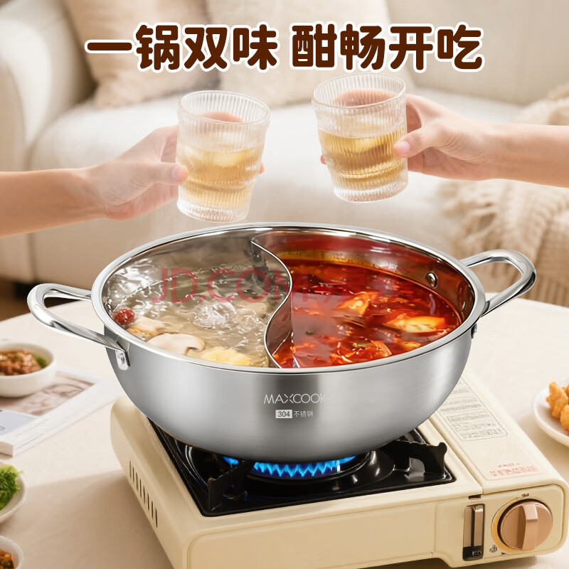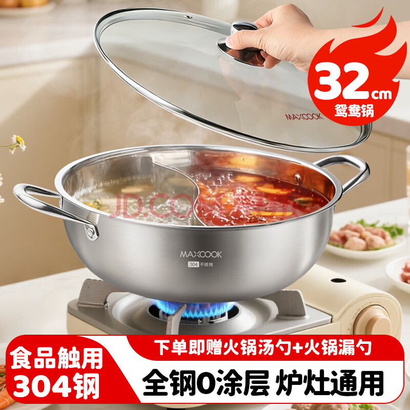 商品相册:美厨(MAXCOOK)鸳鸯火锅 32cm加厚304不锈钢配火锅勺带盖燃气电磁炉通用MCT963第