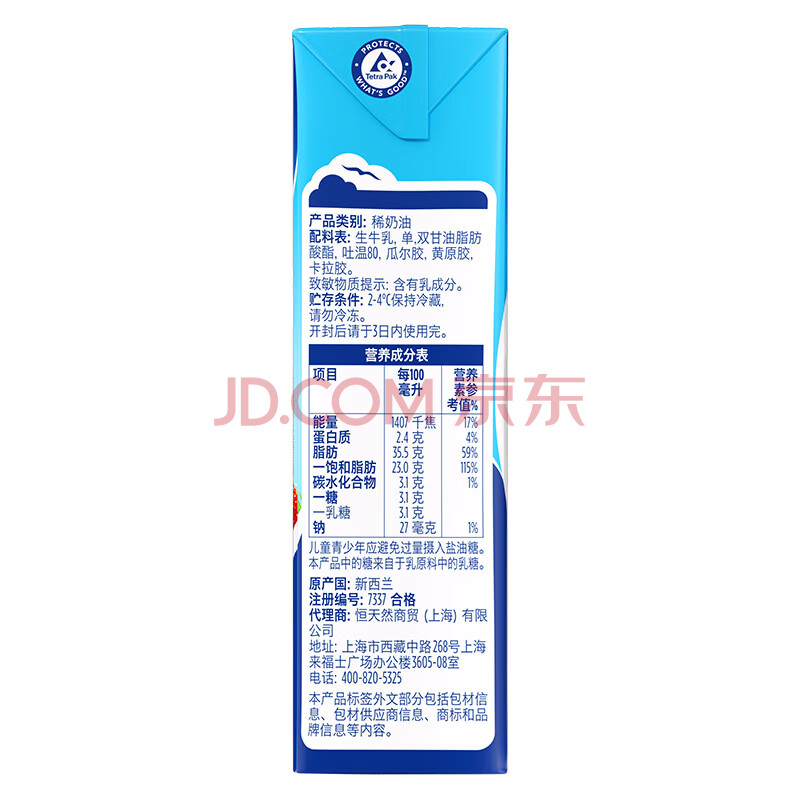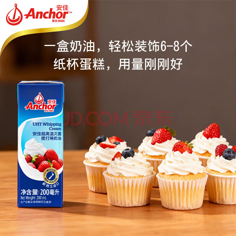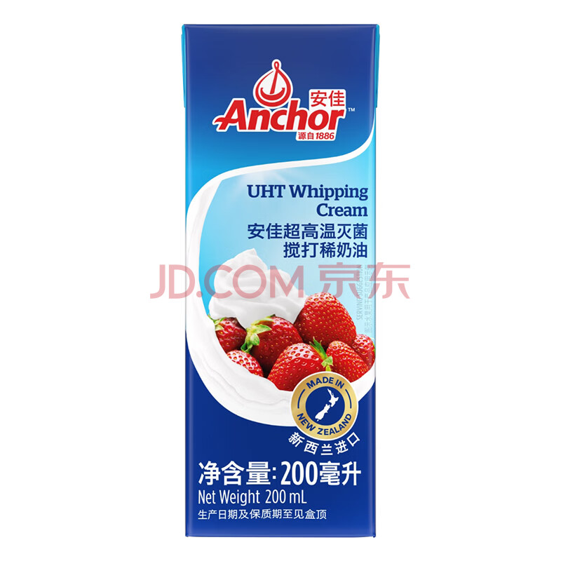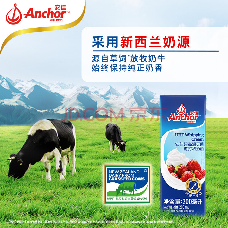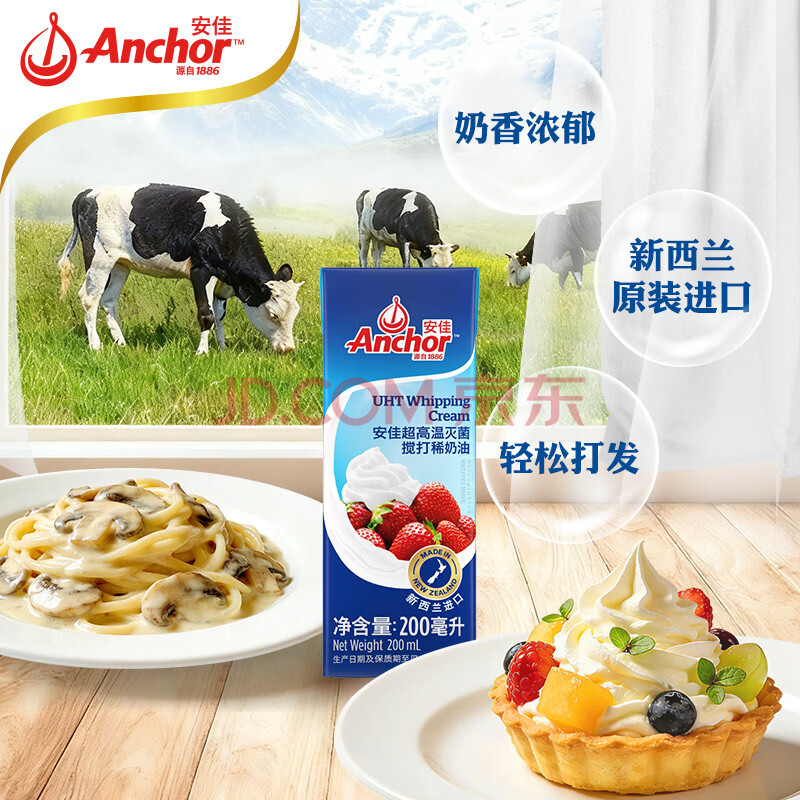 商品相册:安佳(Anchor)新西兰进口 动物奶酪淡奶油稀奶油200ml 冷藏烘焙奶茶DIY第1张/共5