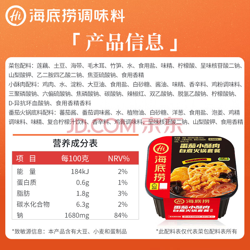 商品相册:海底捞自热火锅 方便速食免煮出游野餐零食番茄小酥肉火锅275g第