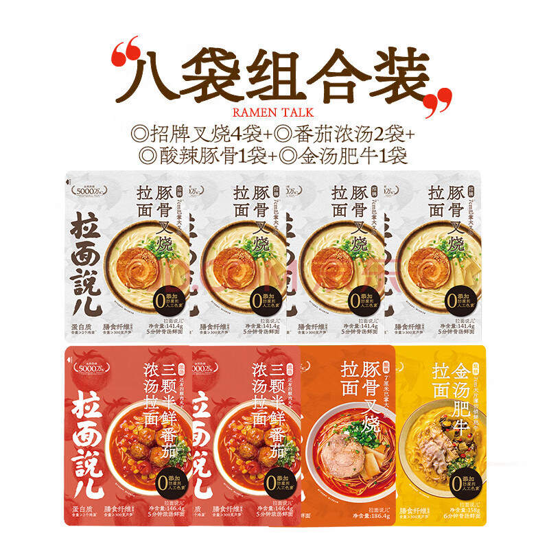 商品相册:拉面说儿非油炸方便面8袋 (招牌豚骨*4+番茄*2+肉酥拌面*1+肥牛*1)1196.4g第