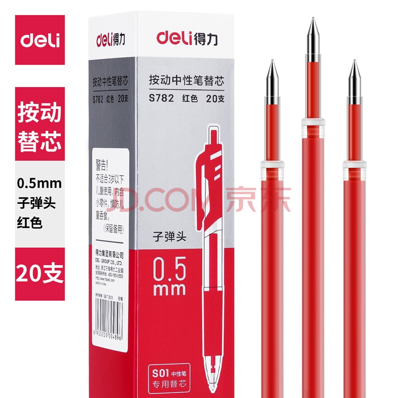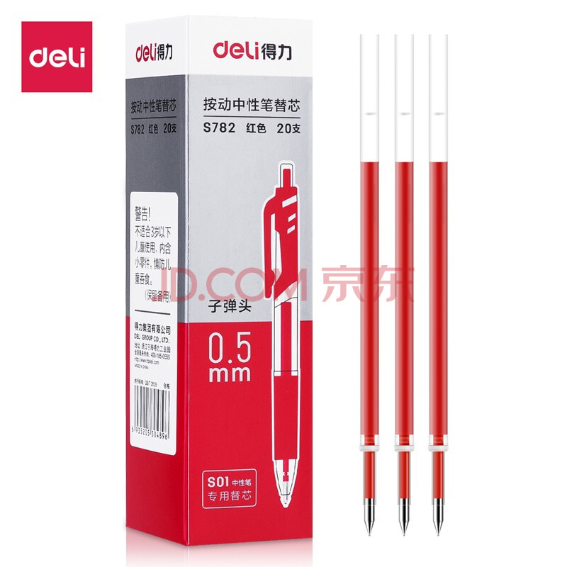 商品相册:【开学必备】得力(deli)0.5mm按动中性笔芯替芯 S01 K35用 红色子弹头20支/盒 12盒装 办公用品 S782第