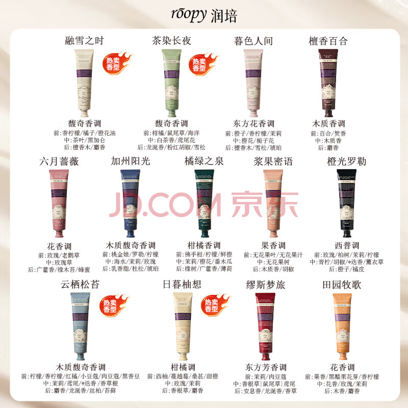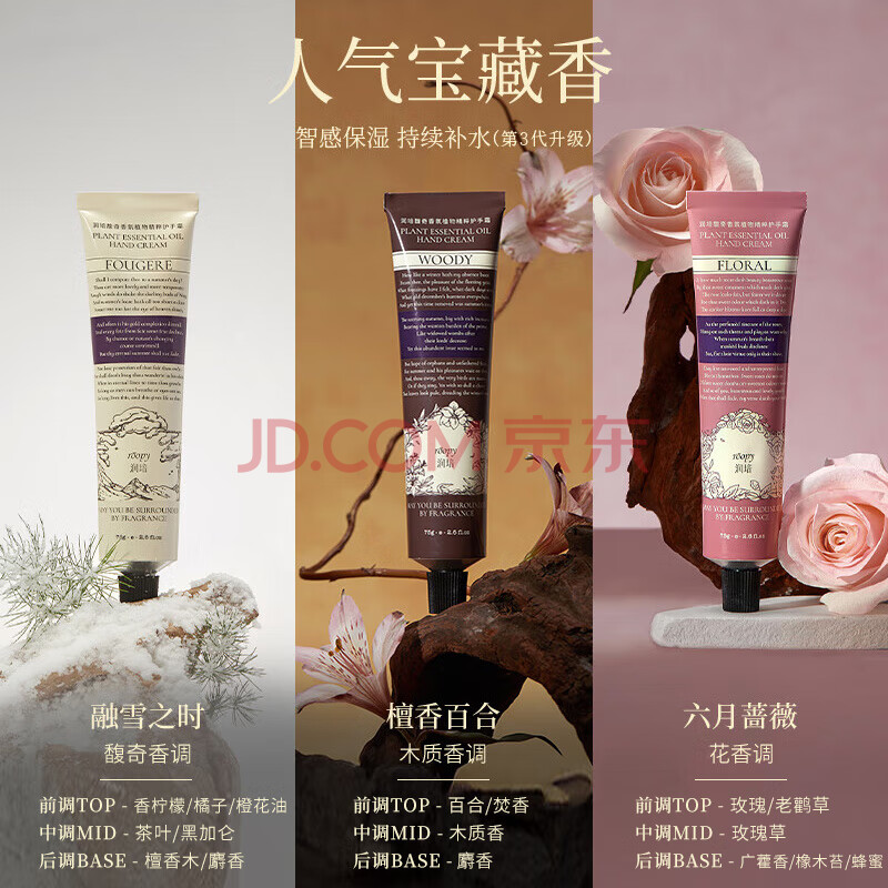 商品相册:润培保湿护手霜(檀香+蔷薇+融雪)清爽保湿生日礼物送女生75g*3支第