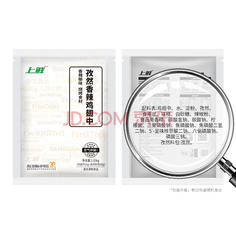 商品相册:上鲜孜然香辣鸡翅中 净重2.06斤 冷冻 烤鸡翅DIY竹签调料第