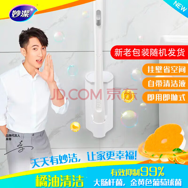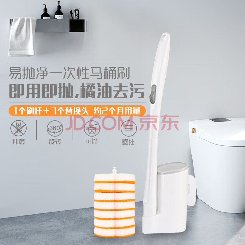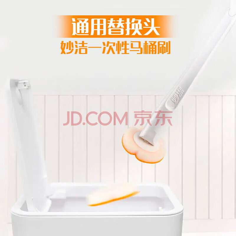 商品相册:妙洁 一次性马桶刷 含本体共7个替换头 可壁挂 即用即抛 橘油去污第1张/共6