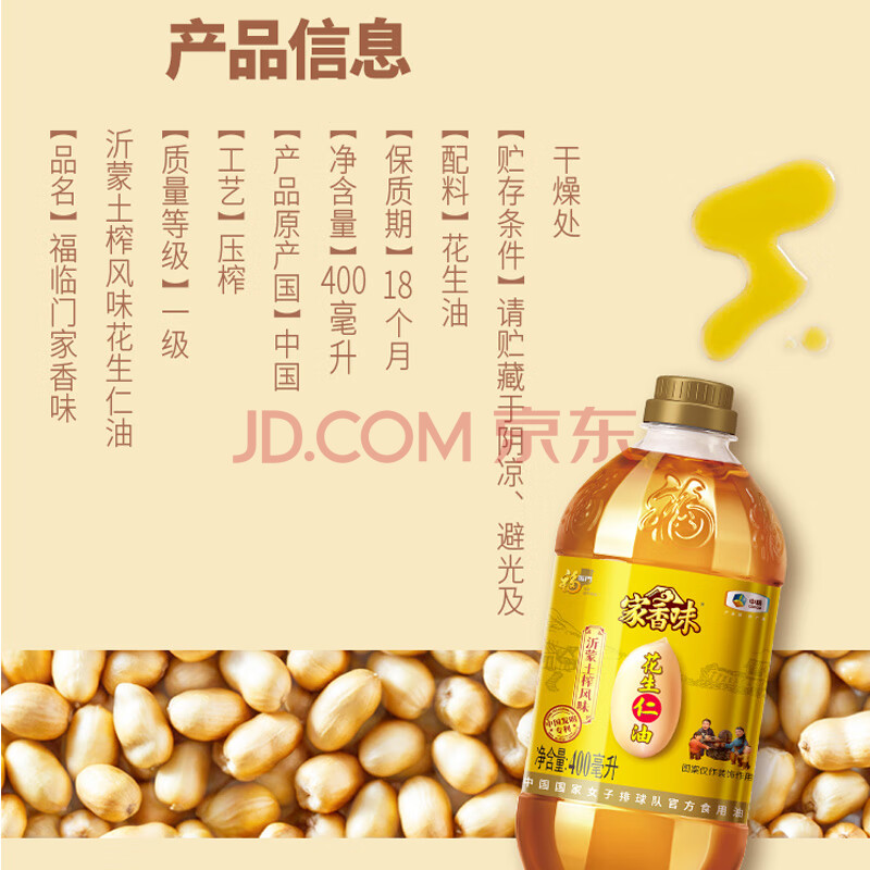 商品相册:家香味沂蒙土榨花生仁油400mL【保真花生油】中粮 新老包装随机发第
