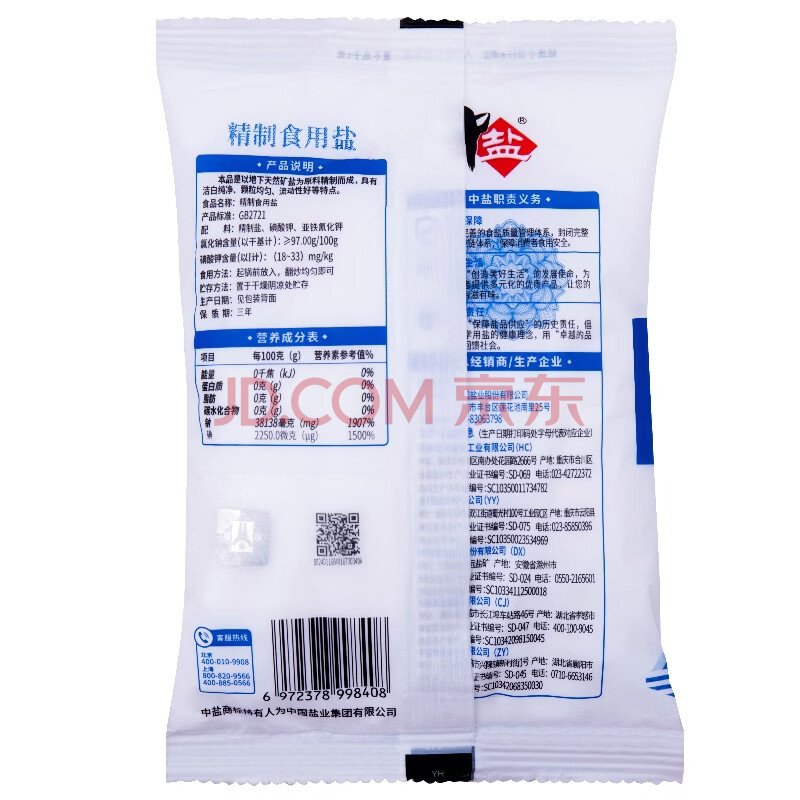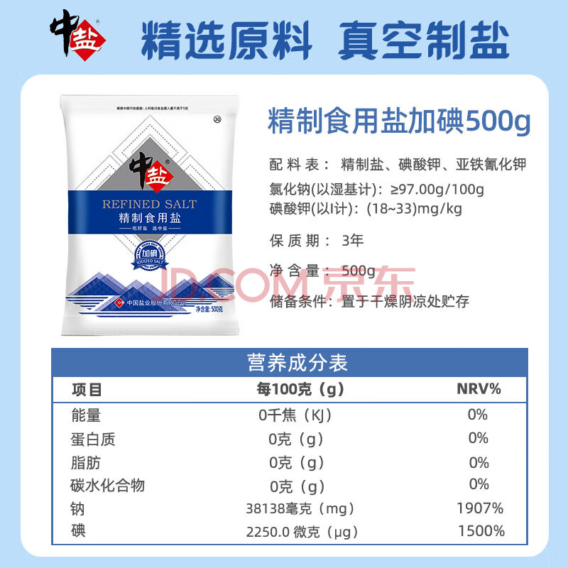 商品相册:中盐 精制盐500g*40整箱装20公斤【加碘】精选原料 吃好盐选中盐第