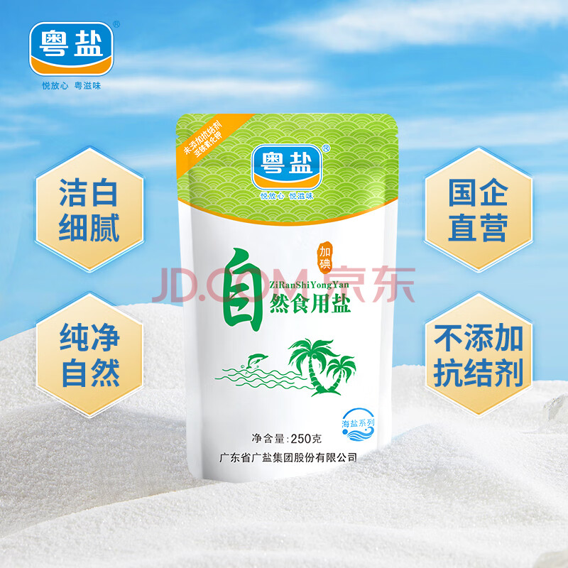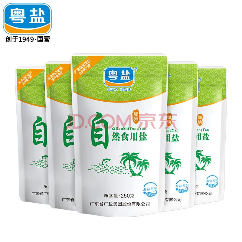 商品相册:粤盐 自然食用盐250g*5袋 海盐加碘盐 无抗结剂 日晒盐 调料第