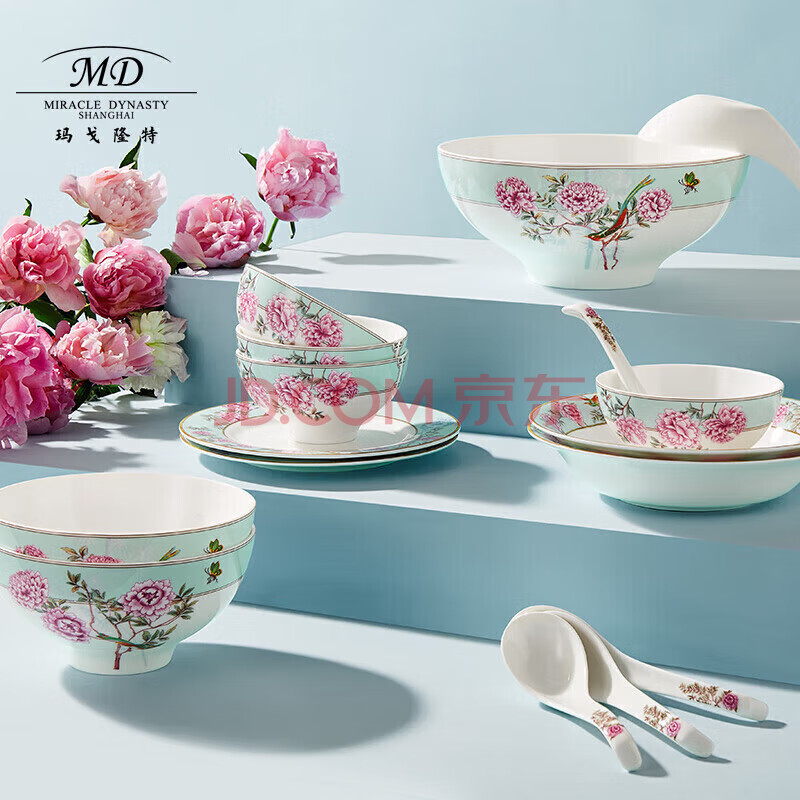 商品相册:玛戈隆特 骨瓷餐具套装碗碟套装中式轻奢家用碗盘碟6人份32头中国花园第