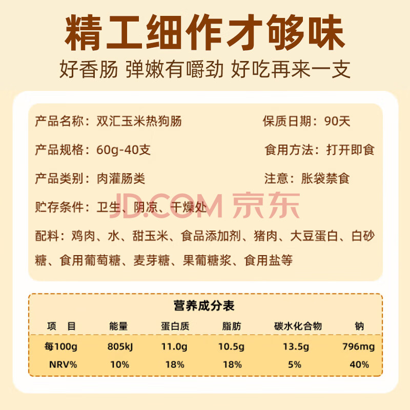 商品相册:双汇 玉米热狗肠 60g*40支 火腿肠 休闲零食 香肠 烧烤露营 速食 出游第