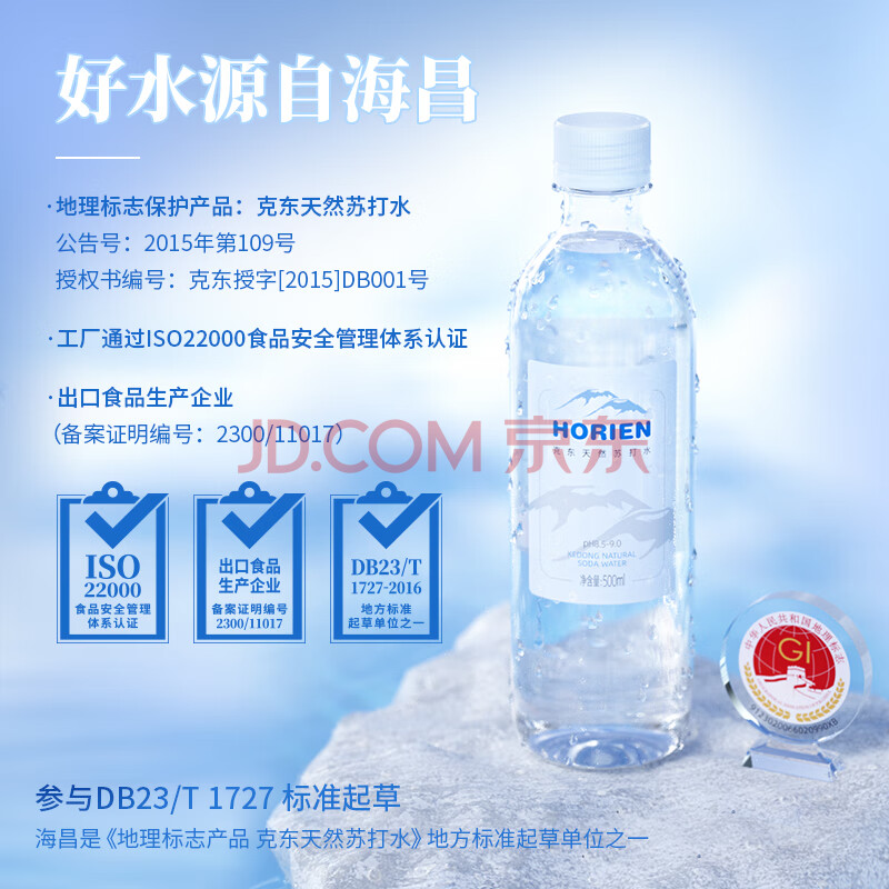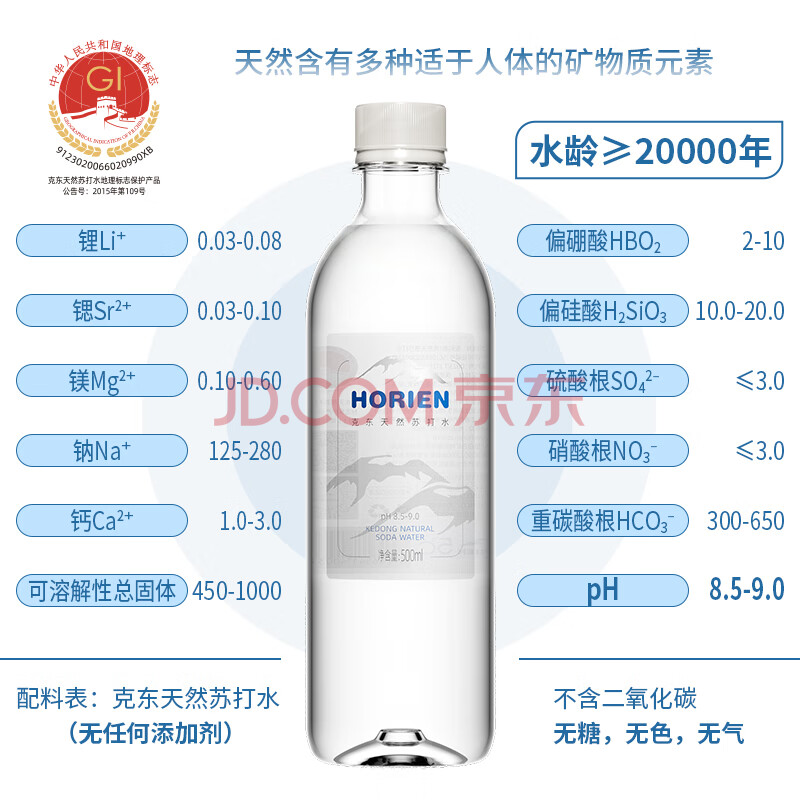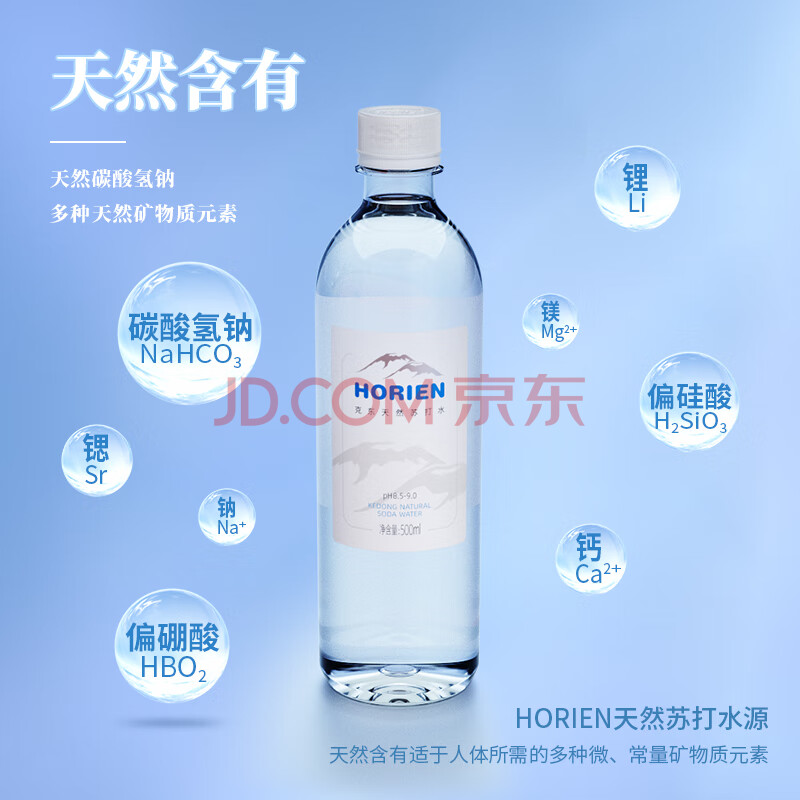 商品相册:5°C(HORIEN5°C)克东天然苏打水无气弱碱pH8.5北纬47°500ml*20瓶第