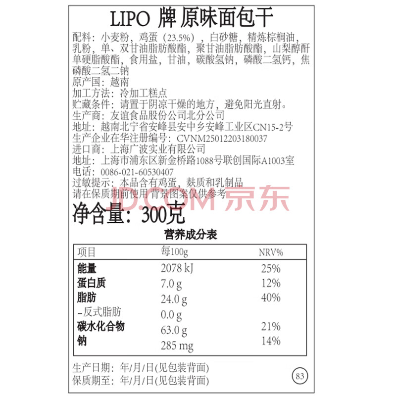商品相册:Lipo原味面包干300g奶油味 越南进口饼干 休闲 年货 出游 野餐第1张/共5