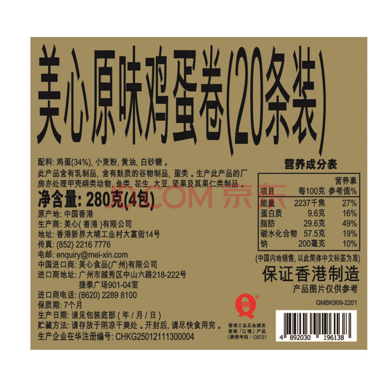 商品相册:美心(Meixin)原味鸡蛋卷280g 香港特产休闲零食饼干企业送礼团购第1张/共5