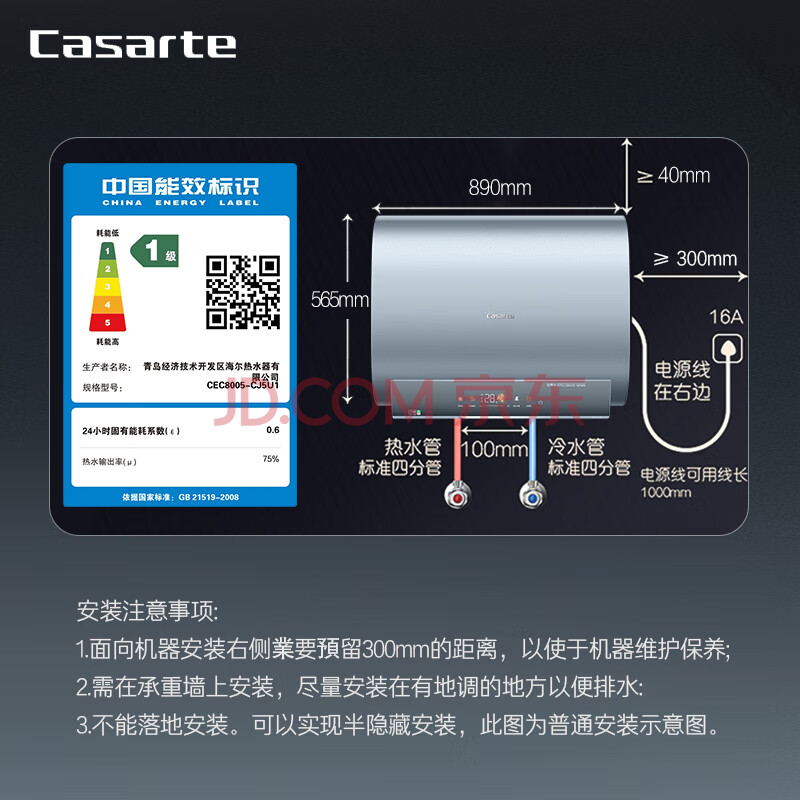 商品相册:卡萨帝(Casarte)80升【CJ5】储水式电热水器家用超薄钛金双胆扁桶型短款速热大水量一级能效CEC8005-CJ5U1第1张/共7