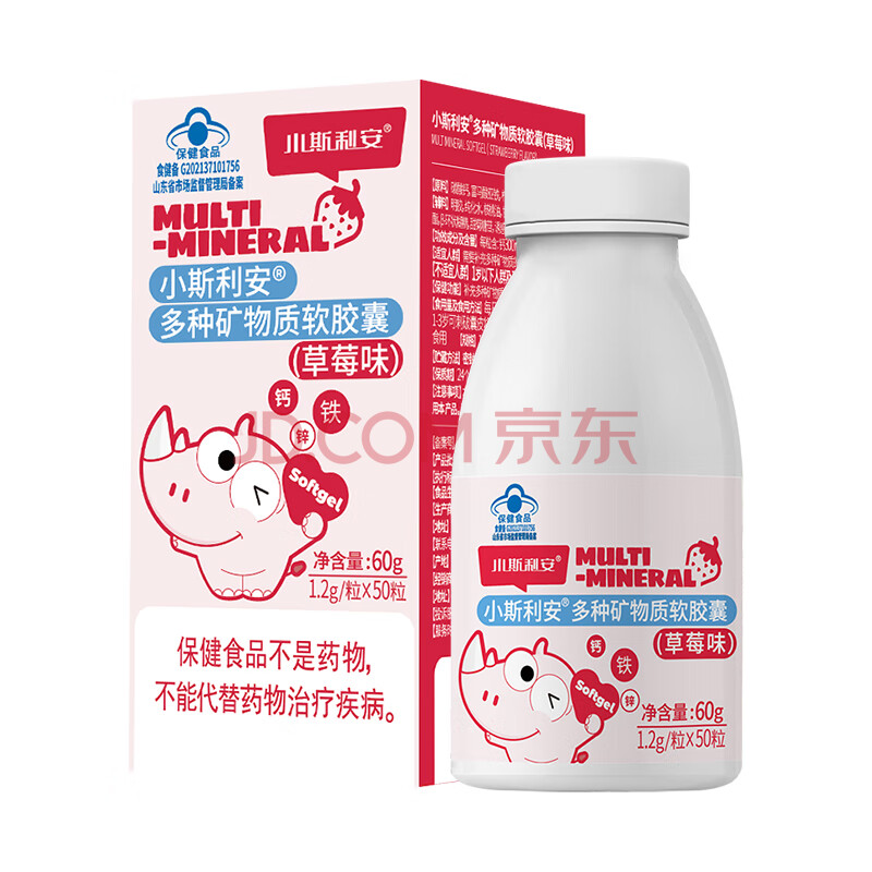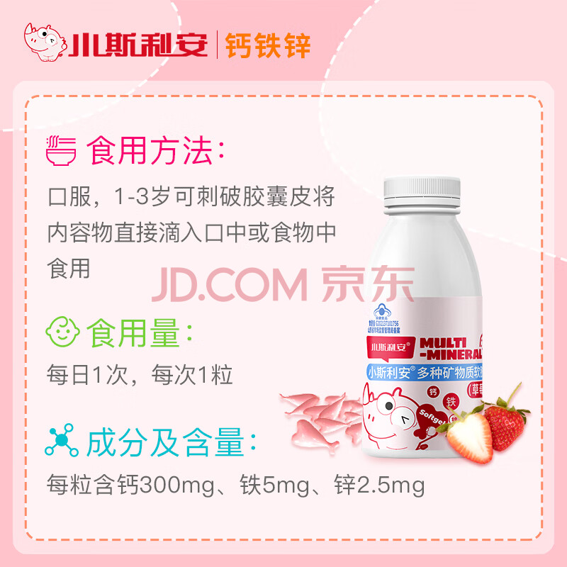 商品相册:斯利安多种矿物质软胶囊儿童补充钙铁锌液体钙1岁以上草莓味50粒第