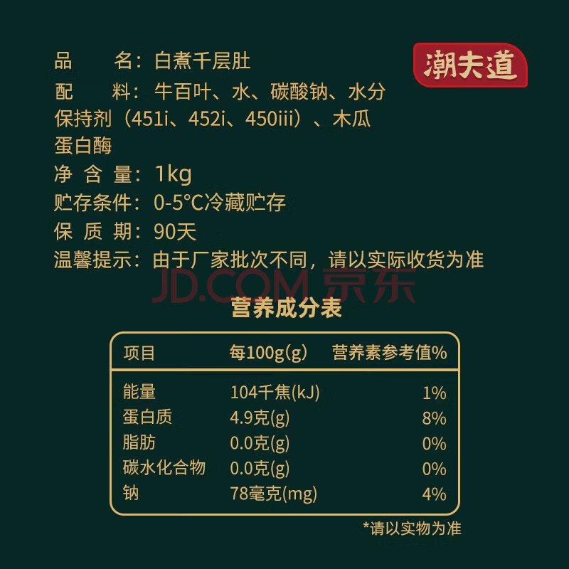 商品相册:潮夫道冷藏白千层2斤涮火锅食材麻辣烫冒菜串串毛肚牛肚牛百叶固形物60%第1张/共9